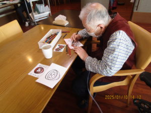 2025.01.10 ケアセンター笠松、心音日記 【笠松】絵手紙【デイサービス】 皆様こんにちは。本日は、絵手紙を作成しました。 ぜんざいと椿の見本を見ながら絵を描いて頂きます。 皆さん集中して塗って頂いた事で、綺麗に仕上げる事ができました。 次回もお楽しみに(^^♪