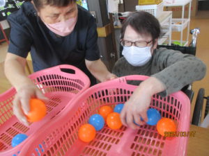 2025.03.7 ケアセンター瑞浪、心音日記 【瑞浪】ボールクロスゲーム【デイサービス】 本日は【ボールクロスゲーム】を行いました(^^♪ オレンジと青のボールがあるので腕をクロスしてすべてのボールを入れ替えっこ していただきました😊 制限時間1分で挑戦していただきました(^_-)-☆ スムーズに成功した方や、やっていくうちにこんがらがり迷う姿、 数が合わなくなり更に混乱する姿など様々でした(*^▽^*) また、皆さま一生懸命やっており真剣な表情が多くみられました✨ 脳みその良いトレーニングになりましたね=^_^=💛