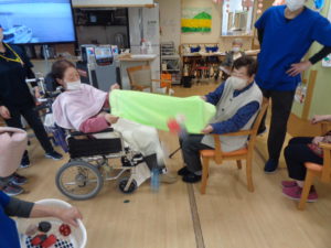 2人ペアを決めて、タオルにお手玉を5個おいて