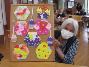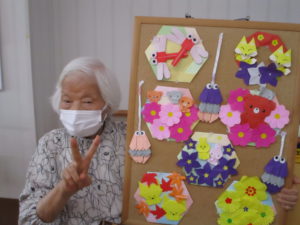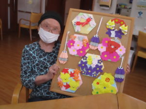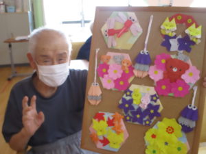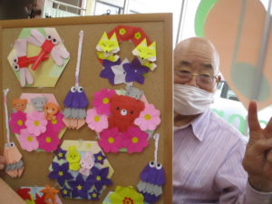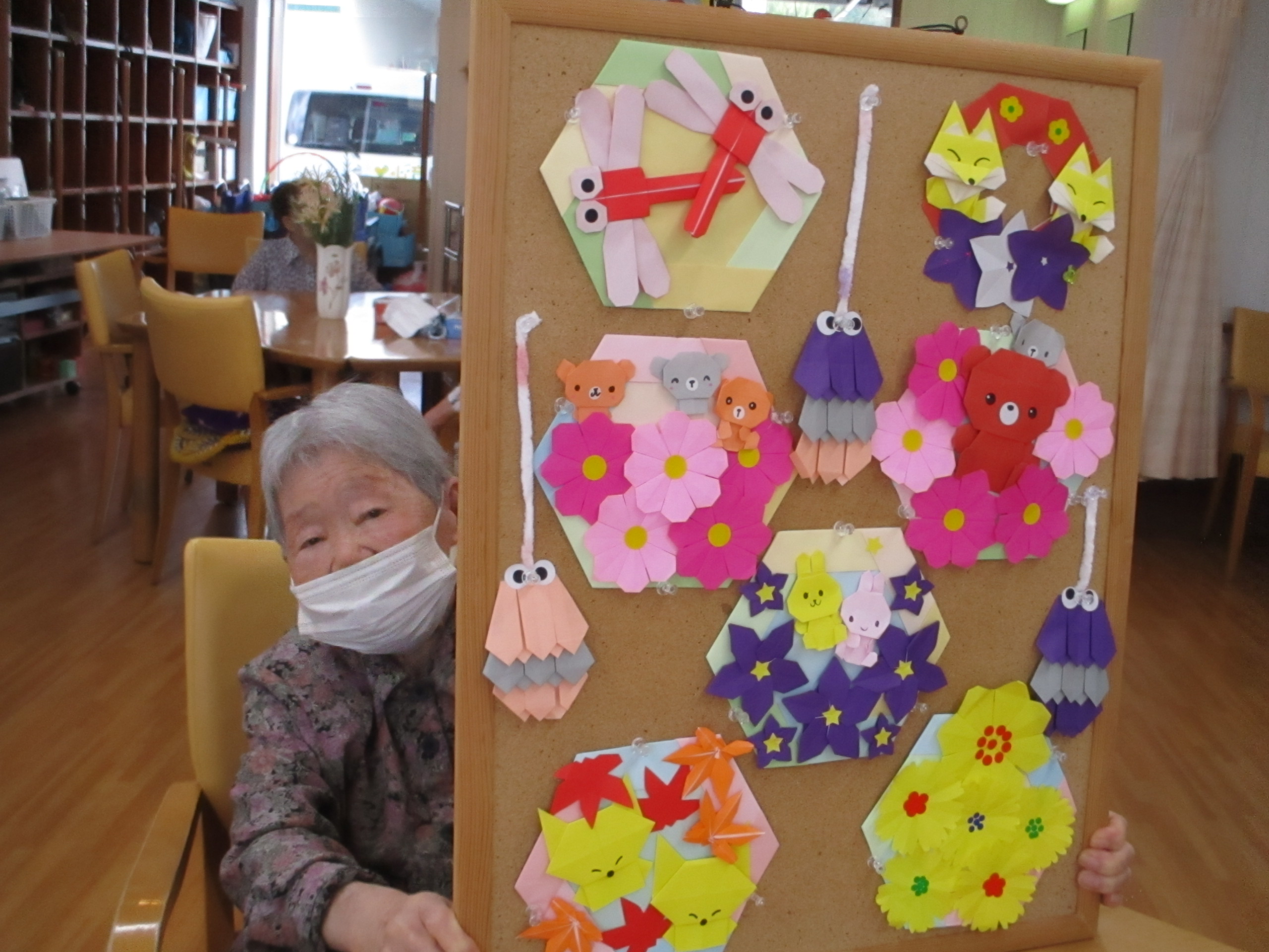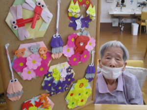2025.10.1 ケアセンター土岐、心音日記 【土岐】作品と一緒に【デイサービス】 折り紙作品と一緒に写真を撮らせてもらいました。 最初はビックリされてましたが、カメラを向けると快く撮らせてくれました。