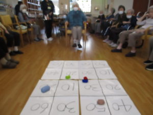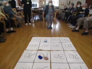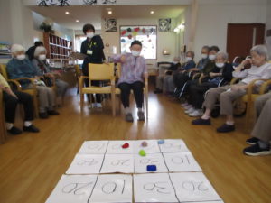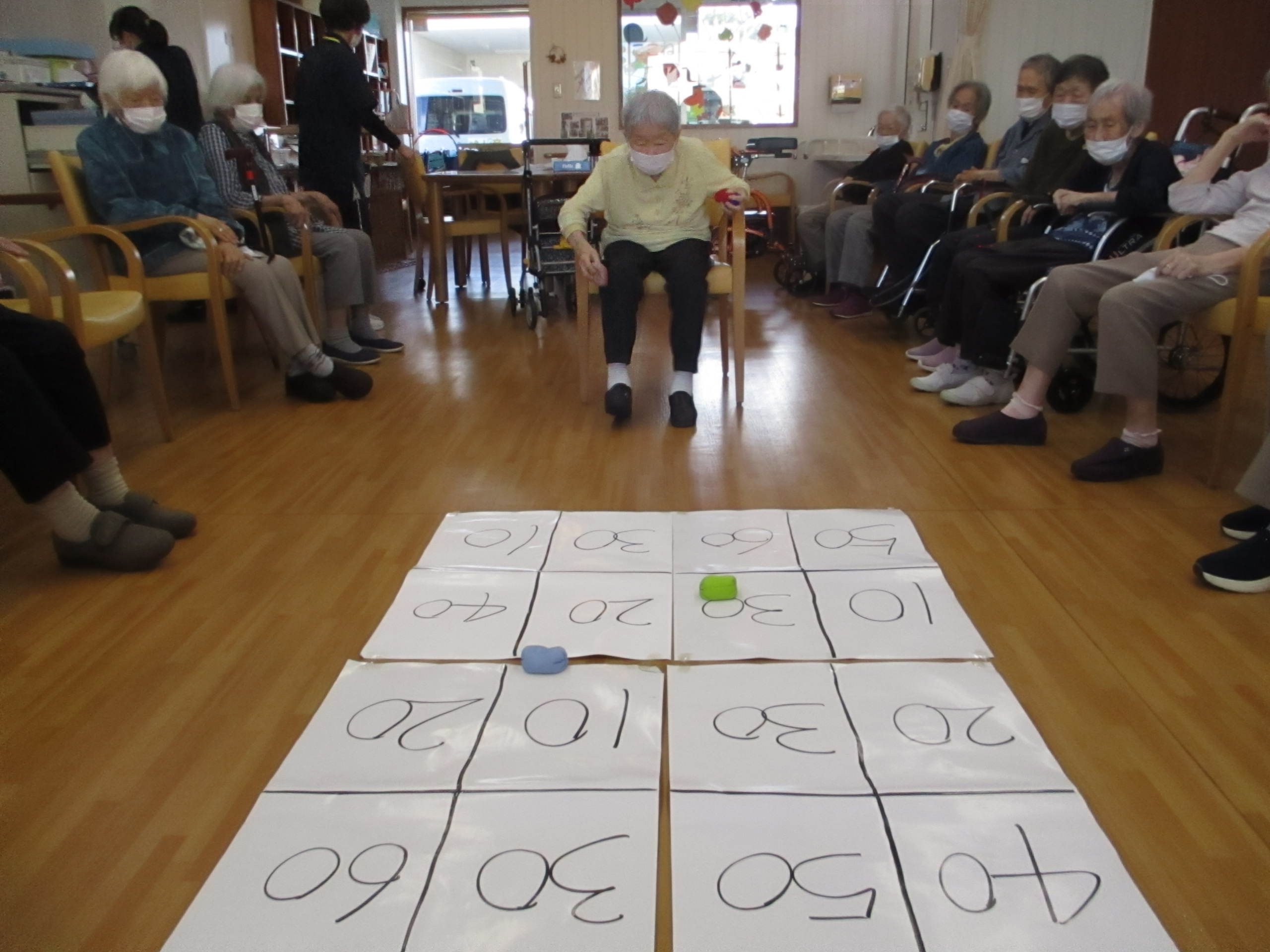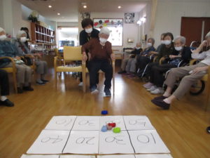 足の甲にお手玉を乗せて蹴り飛ばしていきます。
