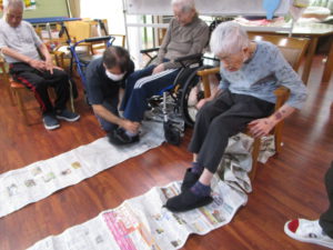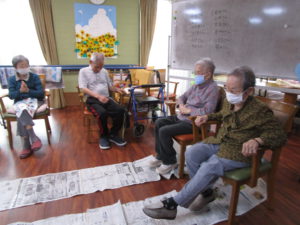 1対1で足を動かして長い新聞を座っている椅子の手前まで持ってきて