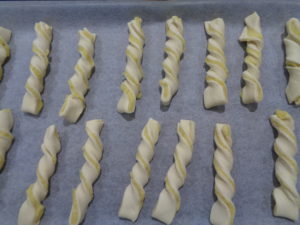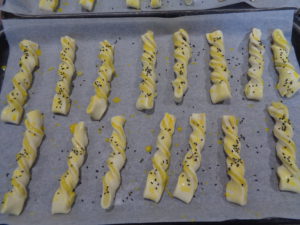 ネジネジしたパイに、卵黄をぬり、ゴマをふりかけます。