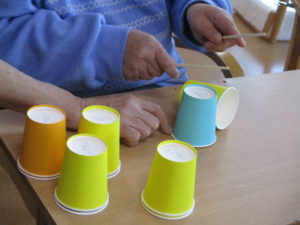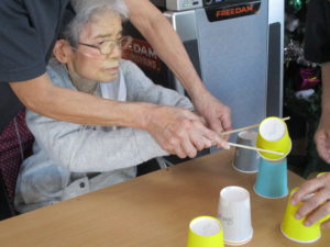 お箸でコップを挟んで重ねる動作は、集中力を養ういい機会です!