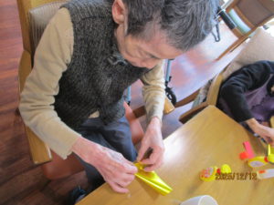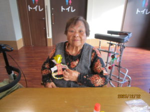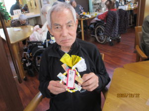 扇子を折って入った後、折り紙の模様を貼り付け、最後に正月の言葉として