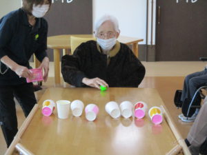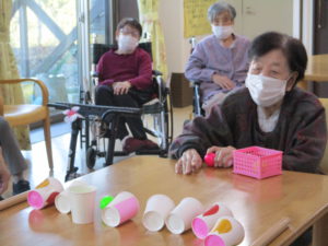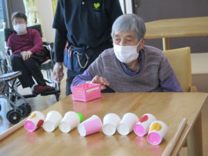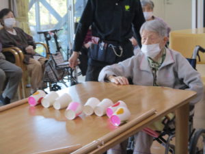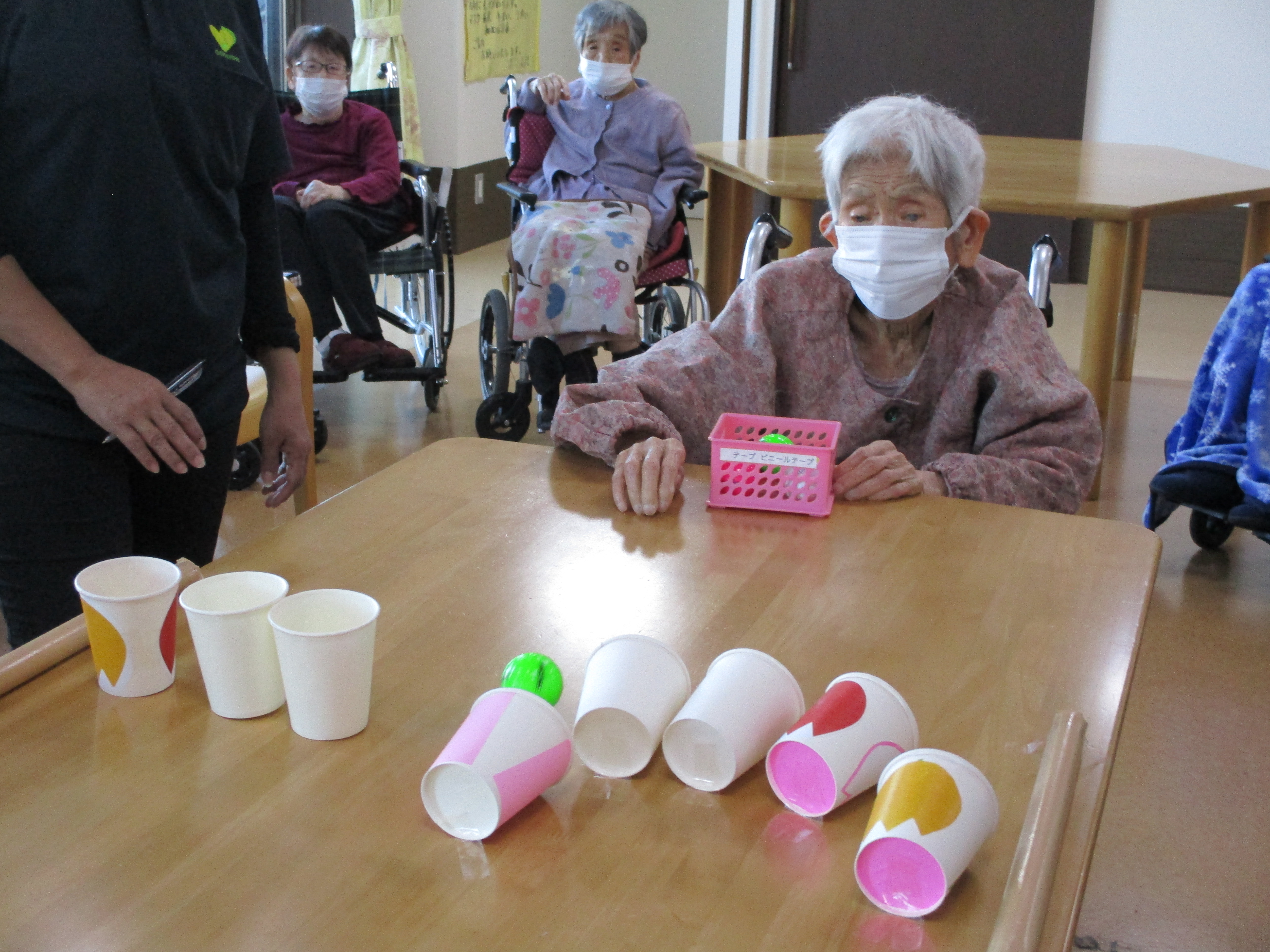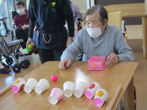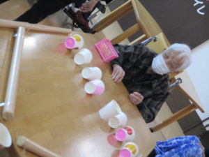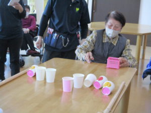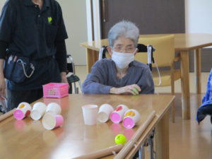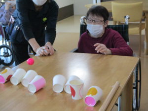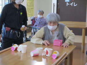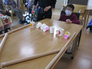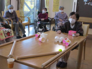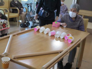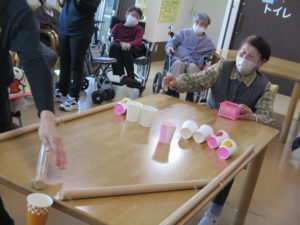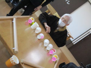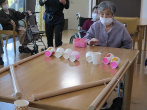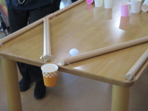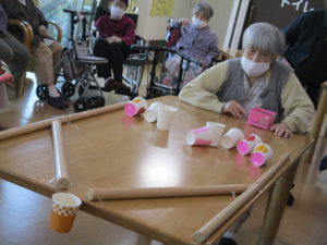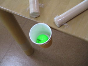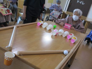 紙コップをゴールに見立て、ゴルフボールを一人7回転がして得点を競います!