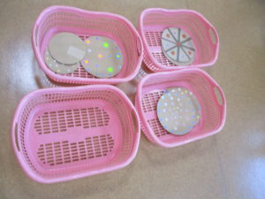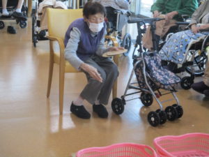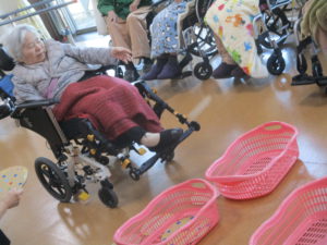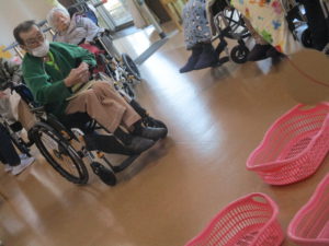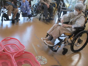 職員お手製のフリスビーをカゴめがけて投げるゲームです!