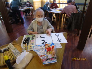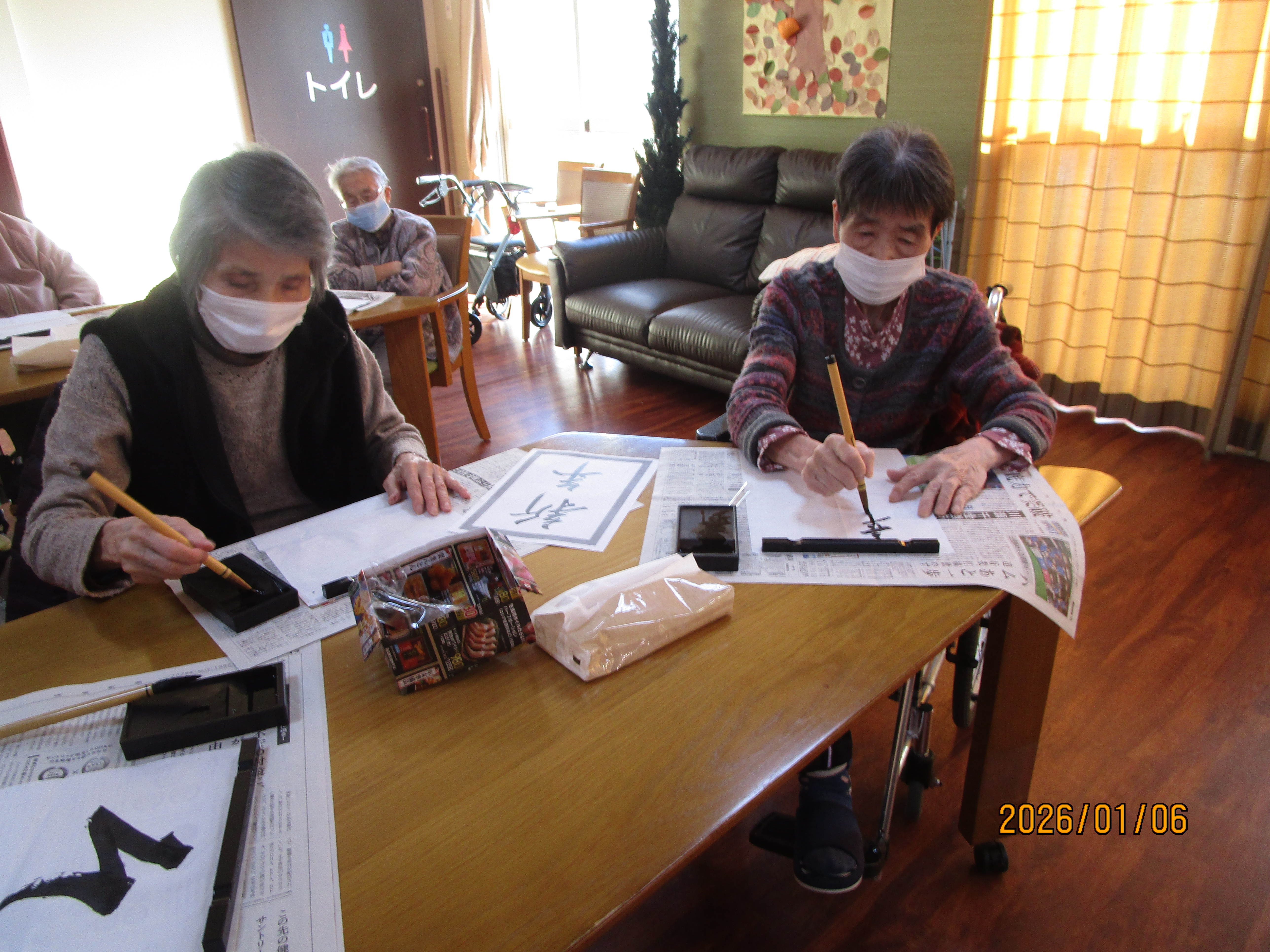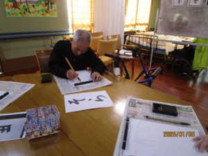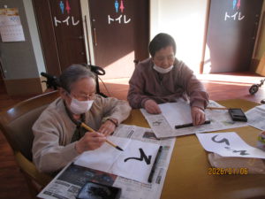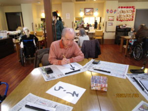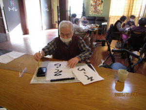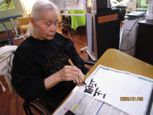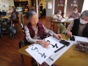 2026.01.6 ケアセンター笠松、心音日記 【笠松】書き初め【デイサービス】 こんにちは! 本日のレクは、書き初めを行いました🖌 「正月」や「そら」、「午」を書かれました! 皆様、集中してお手本を見ながら綺麗に書かれていました!✨ 本日もありがとうございました! 次回もお楽しみに!(*^▽^*)