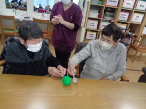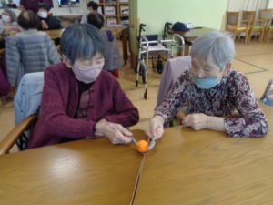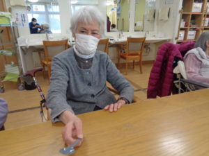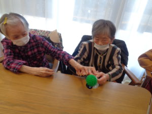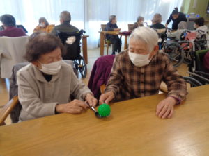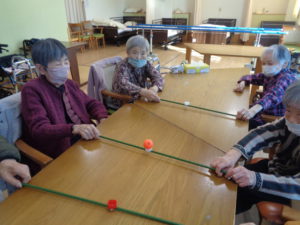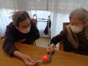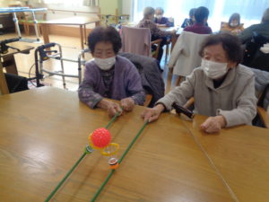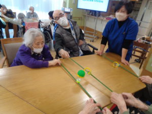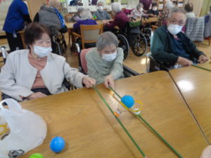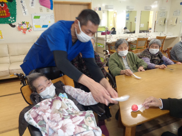 本日のレクリエーションは、スプーンを使ったボールリレーと、