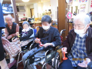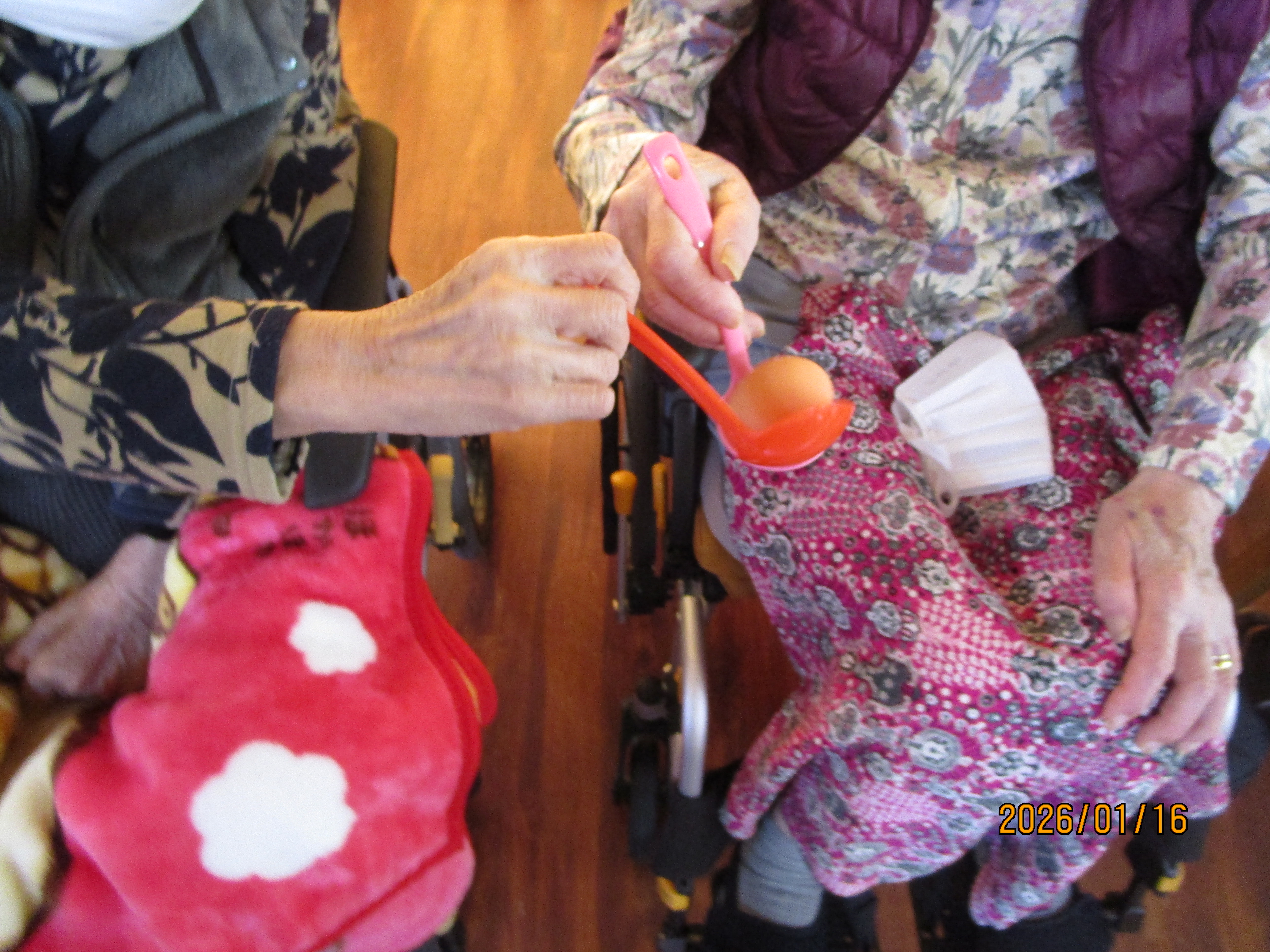 二組向かい合ってお玉に魚、ピンポン玉、お手玉、アヒル等の色んな形の物をのせて