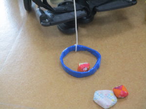 地面に置いたお手玉に、紐でつながった輪っかを投げて引っ張り、