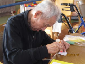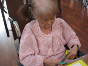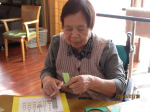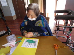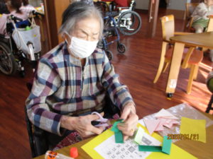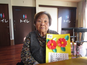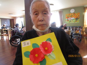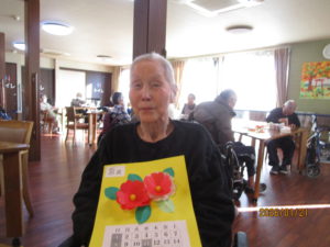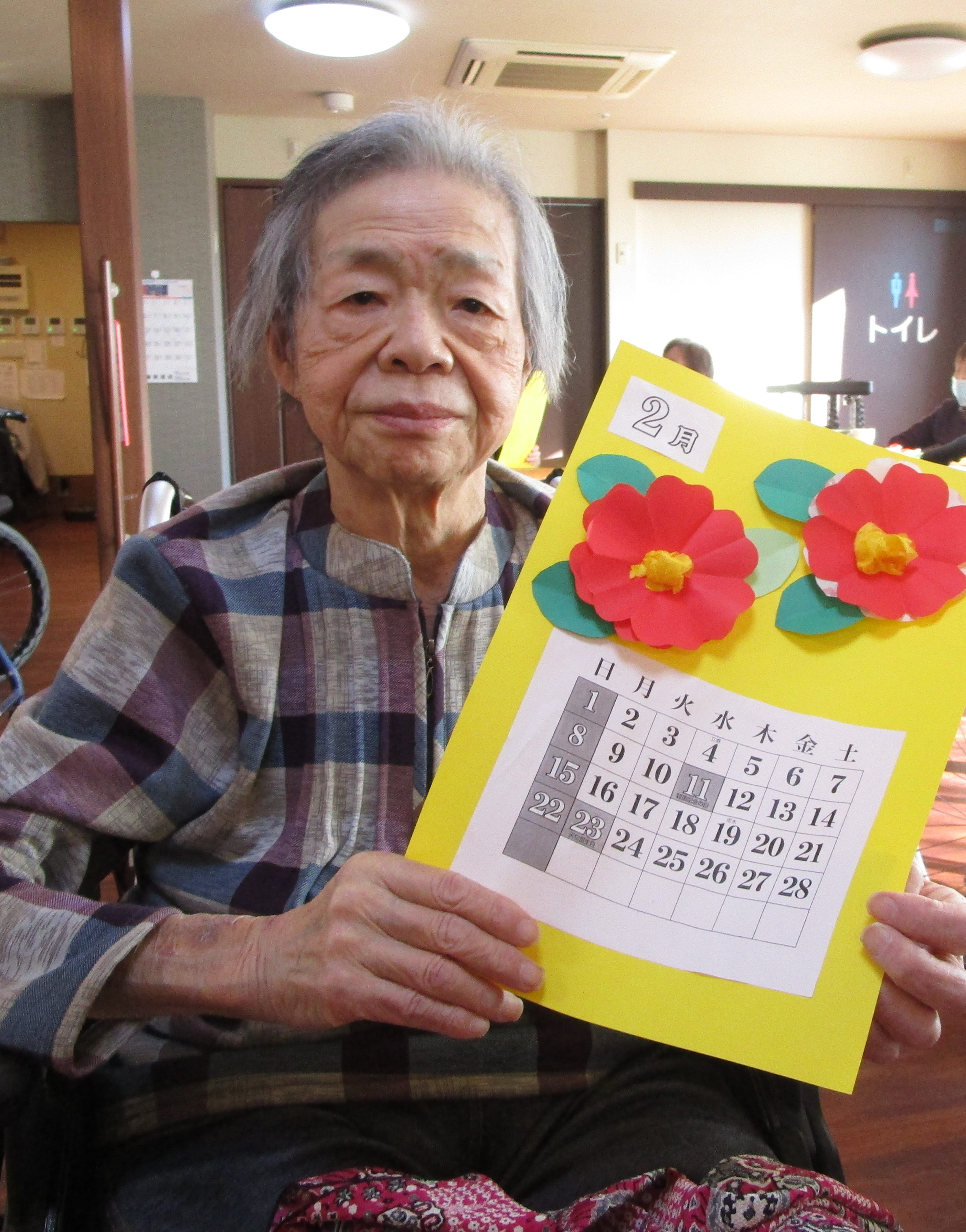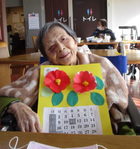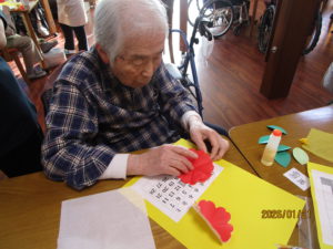 皆さんハサミとのりを使って椿の花をカレンダーの中に