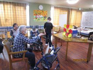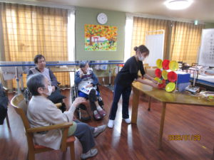 皆様には、吸盤の沢山ついたボール一人三回ずつ投げ自分の点数の計算もしてもらいました