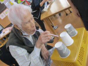 ストローで息を吹きかけ、6個のコップを何秒で落とせるか挑戦していただきました!