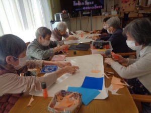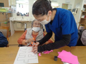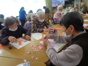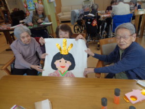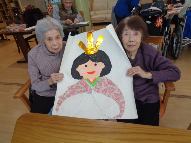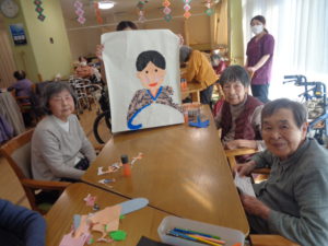 2026.02.27 ケアセンター各務原、心音日記 【各務原】壁画作り【デイサービス】 今日は、3月の壁画作りをしました✨ 3月と言えば、ひなまつり🌸 お内裏様と、お雛様など 折り紙で貼り絵をしていきます(^^♪ 文字の方も出来上がってきました。 続きは、また明日☆彡 それでは、お手を拝借、よ~ ぽん🌸