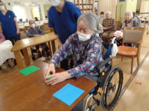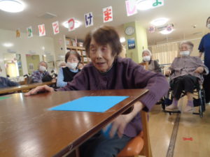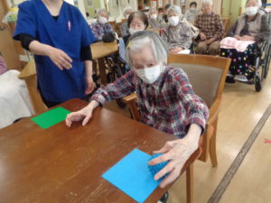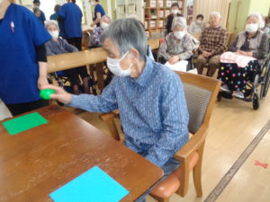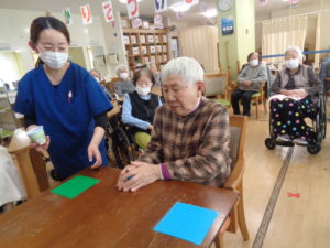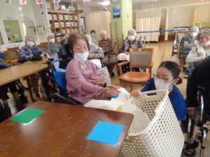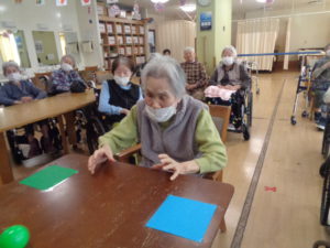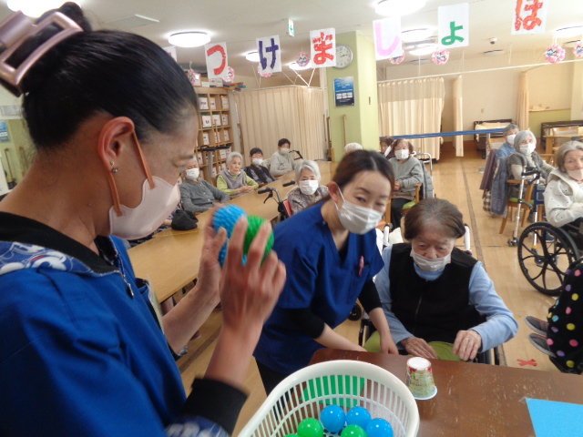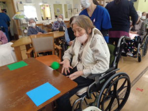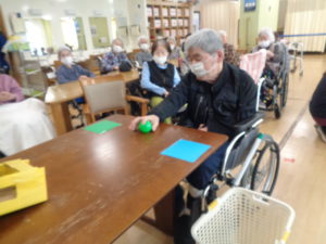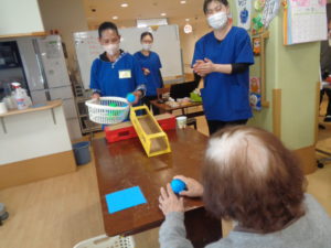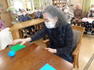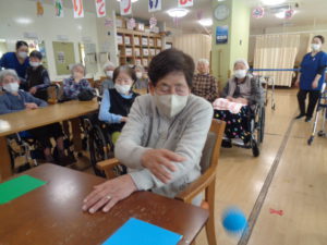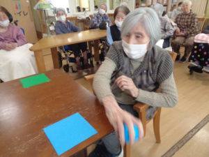 本日のレクリエーションは、青と緑のカラーボールを転がし、