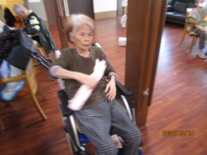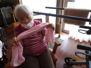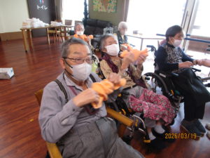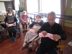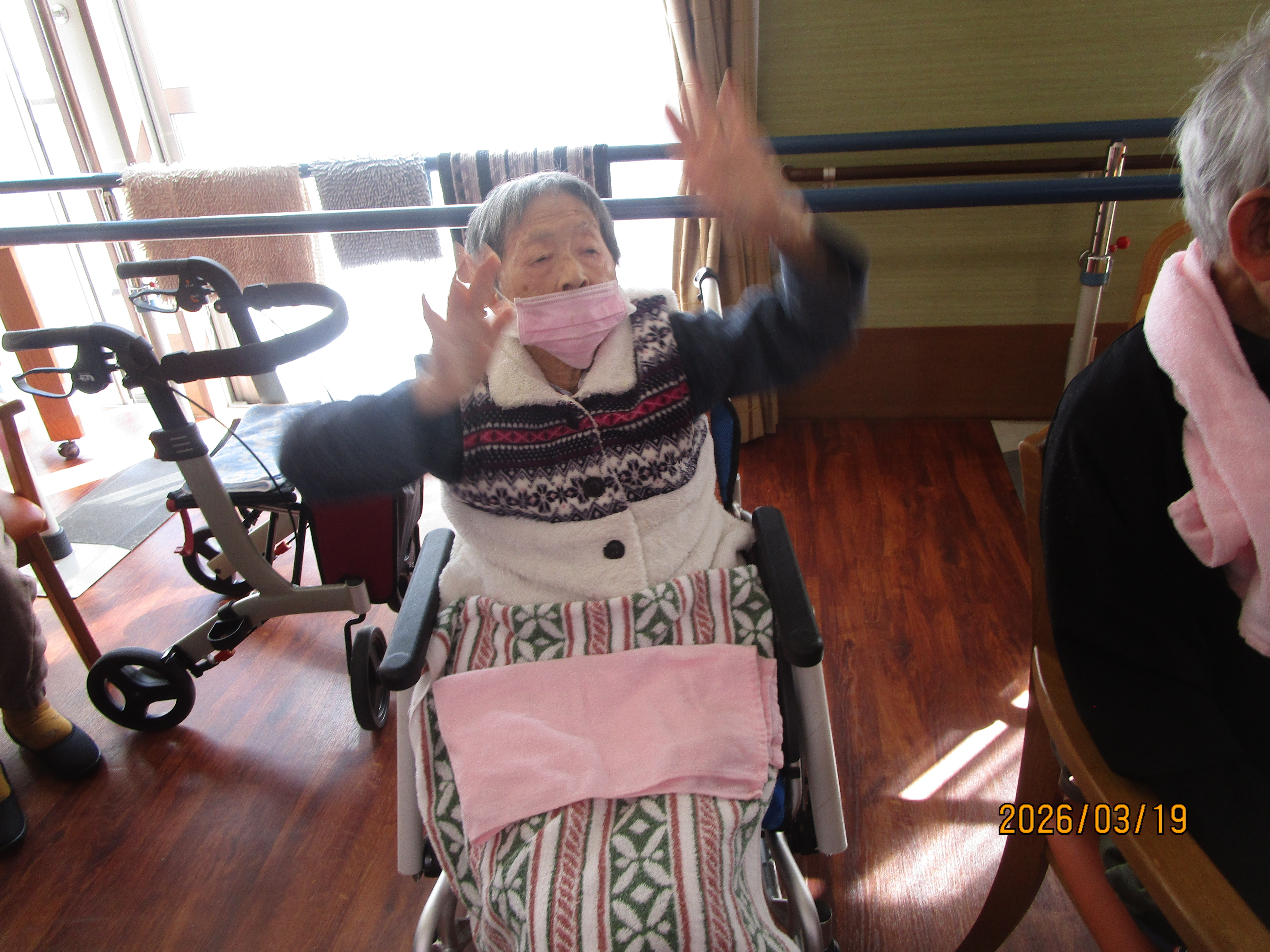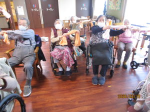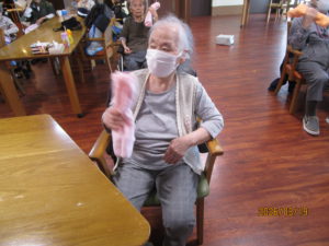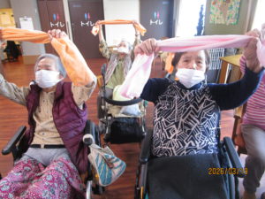 タオルを持ち腕を伸ばしたり、タオルを結んだりしました!