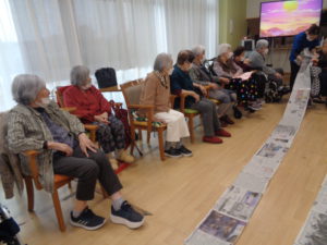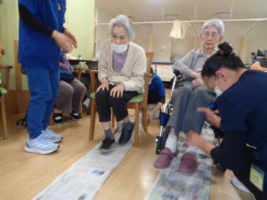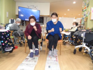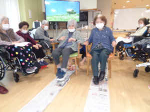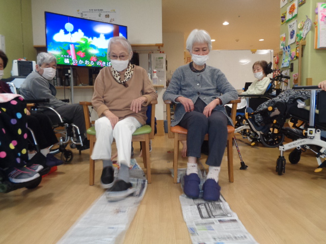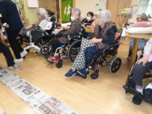 長ーくつなげた新聞を、足や手で