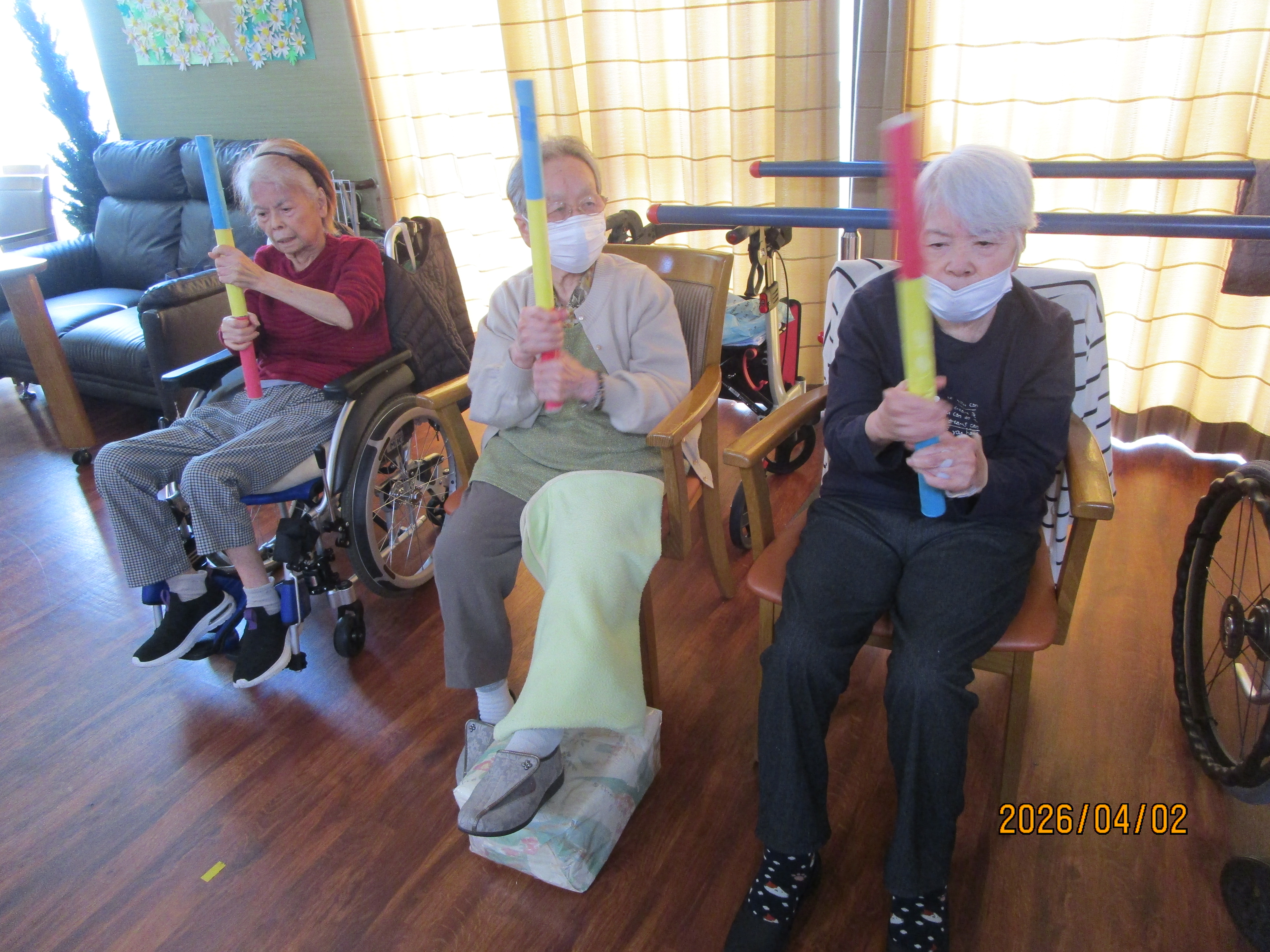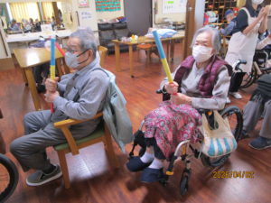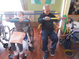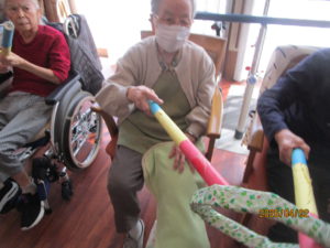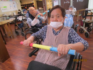 棒体操では、棒を使ってスタッフの姿を見ながら腕や握力の筋力を