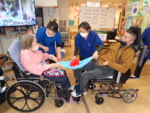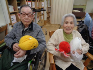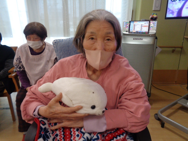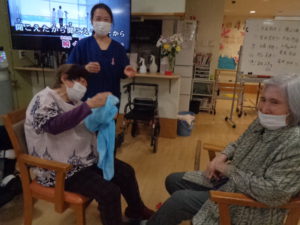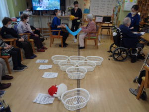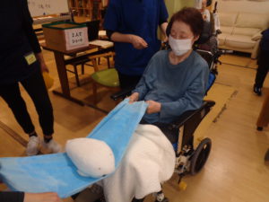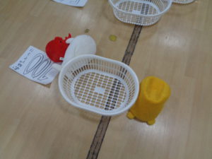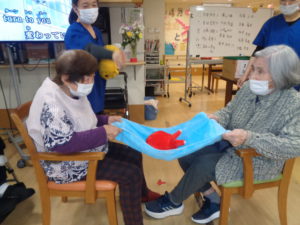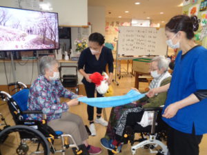 今日は、2人でタオルの端を持って、乗せたぬいぐるみを飛ばしてカゴに入れるゲームをしてみますよ。