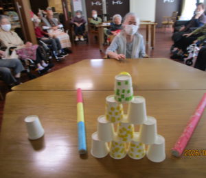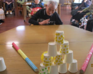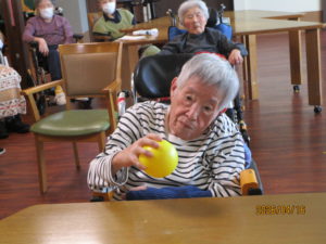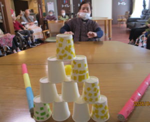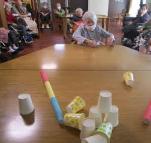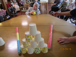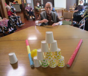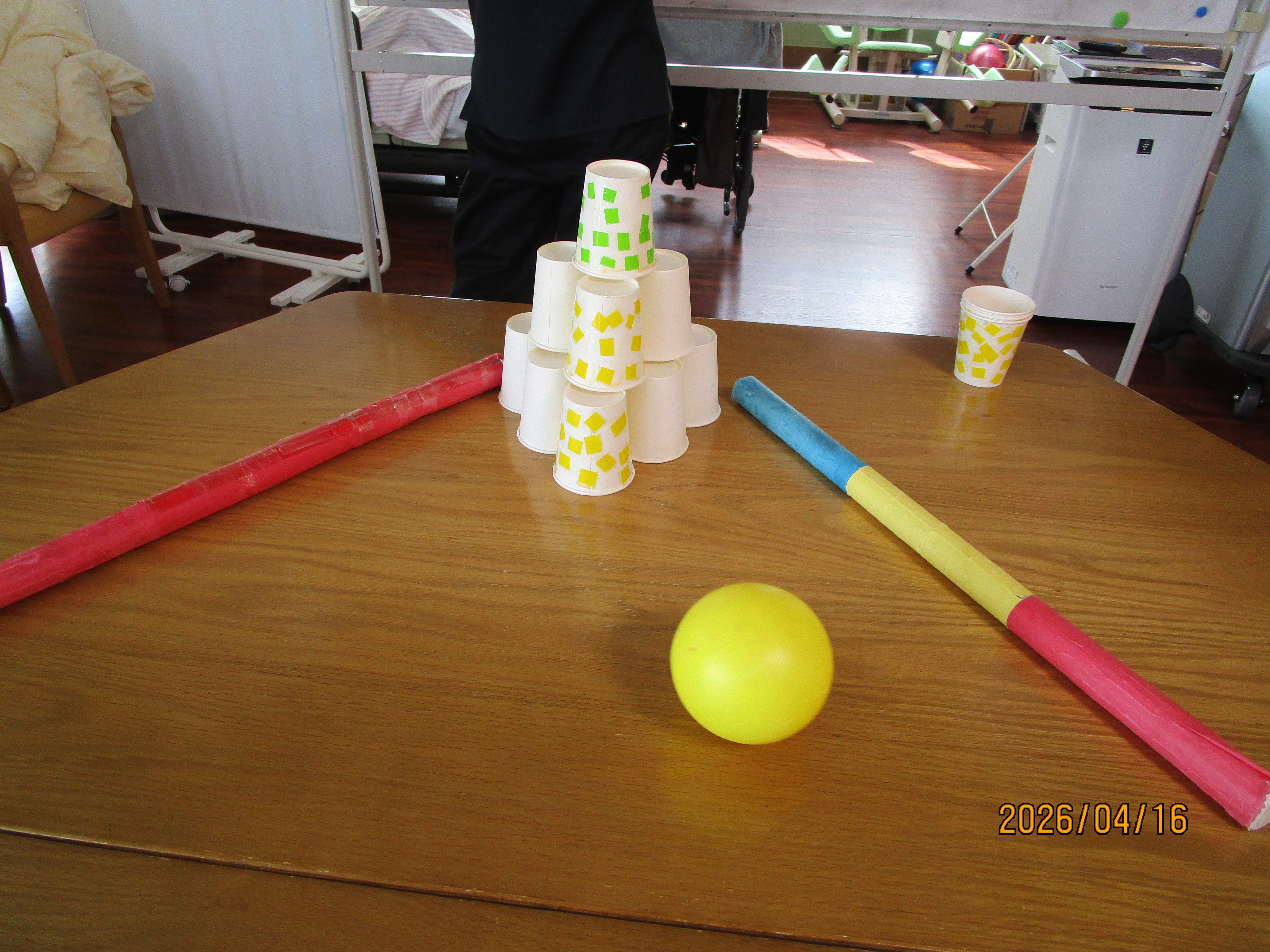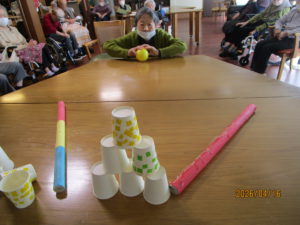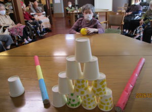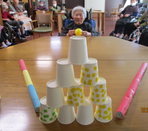 本日のレクは、紙コップをボーリングの球で倒し点数を競いました🤗