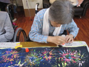 2020.06.30 ケアセンター笠松、心音日記 【笠松】7月の壁画づくり【デイサービス】 みなさまこんにちは。 本日は壁画づくりの最終日です。 花火大会の壁画完成です♪ 7月もよろしくお願いいたします。