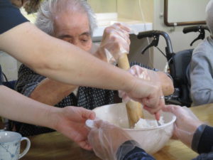2020.11.12 ケアセンター笠松、心音日記 【笠松】五平餅づくり二日目【デイサービス】 みなさまこんにちは。 本日も五平餅づくりです! みなさまでご飯をまんべんなくつぶしていきます。 今日ももちもち食感のおいしい五平餅が出来上がりましたよ♪ 本日誕生日のご利用者様の誕生日会を行いました♪