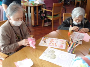 2021.02.27 ケアセンター笠松、心音日記 【笠松】壁画作り2日目【デイサービス】 本日もみなさんに桜の花を作ってもらいました。 お花紙を丁寧にひらいてくださったり、 折り紙の花をペタペタと貼ってくださいました。 誕生日のご利用者様です! 明日が誕生日という事でお祝いしました! おめでとうございます!