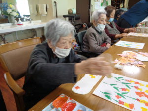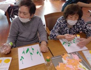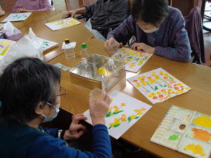 菜の花の形のスタンプを、ペタペタと押していきます。
