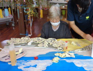 2021.06.30 ケアセンター笠松、心音日記 【笠松】7月の壁画完成🌺【デイサービス】 みなさまこんにちは。 本日も皆様で壁画づくりを行いました。 背景チームと花チームに分かれて作業を行いました。 最後に花や葉っぱをくっつけて… 夏らしい壁画が完成しました♪ 7月よろしくお願いいたします!