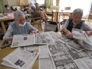 休み時間に皆さまにお手伝いのタオル切りと新聞たたみを