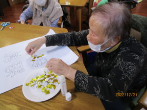 2022.12.27 ケアセンター笠松、心音日記 【笠松】壁画作り【デイサービス】 こんにちは☺ 今日は壁画作りを行いました🐇 折り紙を下絵に沿って貼っていきます。 黙々と、集中して作業してくださっています。 これは何でしょうか🐇 早ければ明日完成予定です✨ どんな絵になるか、お楽しみに☺