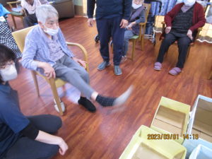 2023.03.1 ケアセンター笠松、心音日記 【笠松】スリッパ飛ばし大会【デイサービス】 みなさまこんにちは。 本日はスリッパ飛ばし大会を行いました! みなさま気合を入れて取り組まれました! 100点に入ったときには拍手が巻き起こりました! 明日も頑張りましょう!