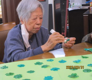 2023.03.31 ケアセンター笠松、心音日記 【笠松】☘クローバー畑の完成🍀【デイサービス】 みなさまこんにちは。 本日も壁面作りです! お花やクローバーをみなさまでどんどん作っていきます! いよいよ完成が近づいてきました! そしてついに・・・! 素敵な壁画が出来ました☘🍀 4月もお楽しみに!