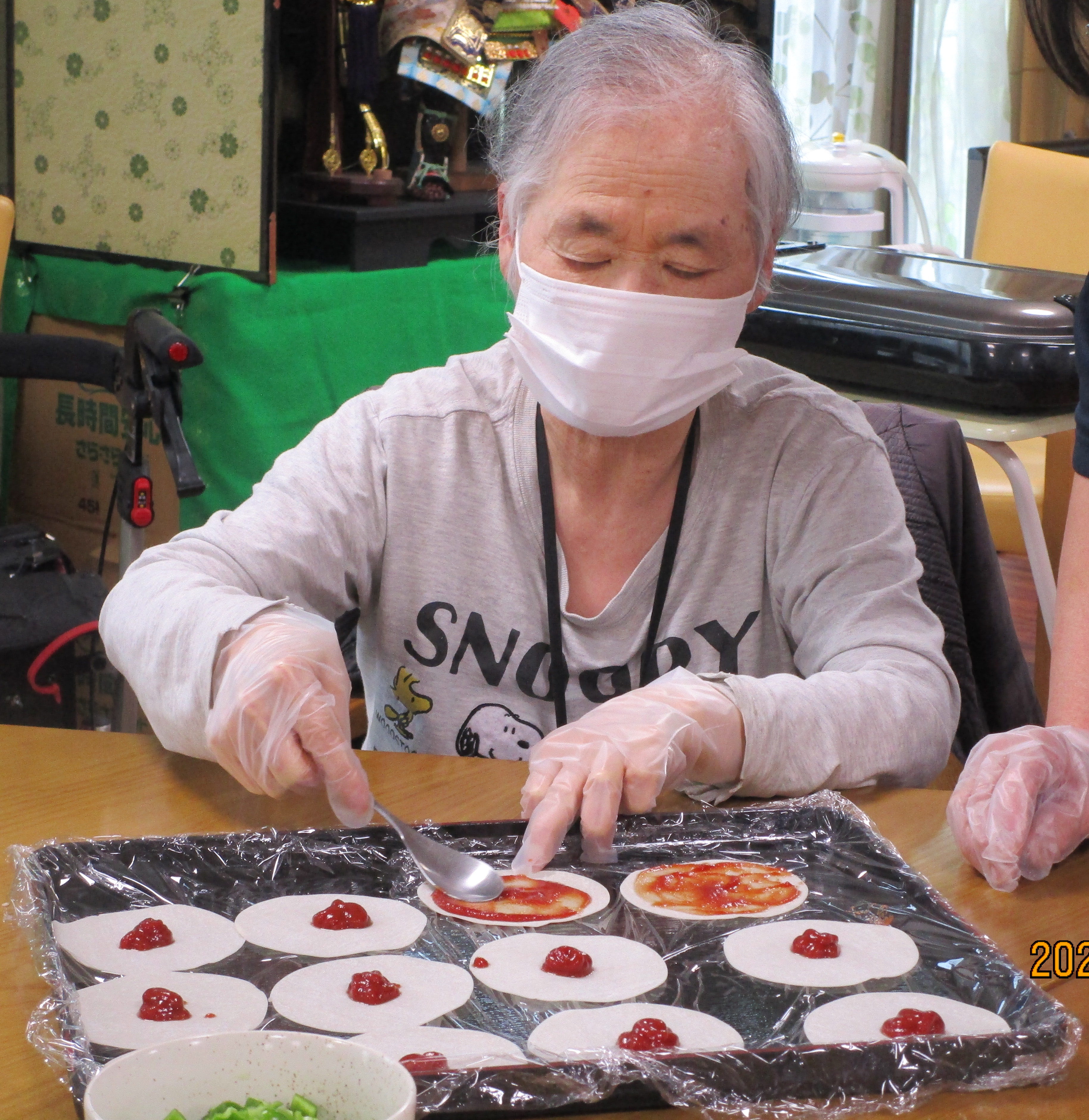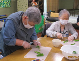 2023.04.15 ケアセンター笠松、心音日記 【笠松】餃子の皮DEピザ作り🍕二日目【デイサービス】 みなさまこんにちは。 本日もピザ作りです! 具材を混ぜたり、切ったりと・・・ 分担で作業していきます! ホットプレートで焼いて完成です! 今回もおいしくできました!