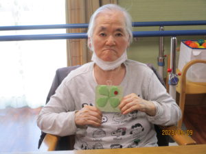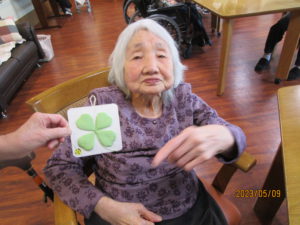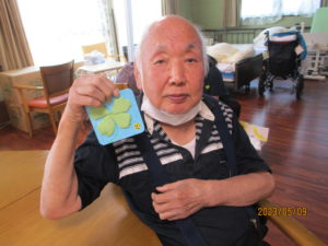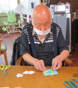 2023.05.9 ケアセンター笠松、心音日記 【笠松】今月のクラフト🍀二日目【デイサービス】 みなさまこんにちは。 本日もクラフトを行いました! ハサミを使ってパーツを切っていきます。 パーツを貼って、完成! 一緒に記念撮影です! 明日もお楽しみに!