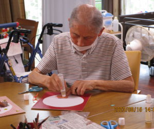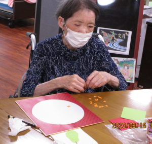 2023.08.15 ケアセンター笠松、心音日記 【笠松】今月の色紙飾りは・・・🍎【デイサービス】 みなさまこんにちは。 本日は色紙飾りを作りました! 画用紙を切り貼りします。 この色合いは・・・? 完成です! りんご、柿などなど、秋の味覚を先取りしました🌰