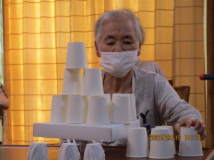 紙コップを崩さないように・・・みなさまで固唾をのんで見守るハラハラのゲームです!