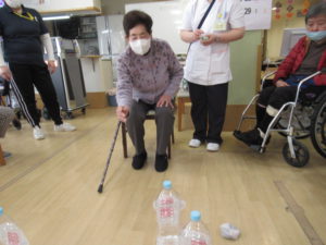 お手玉で『鬼』に見立てたペットボトルを倒して点数を競い合いました♪