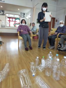 ペットボトル倒しです。足腰丈夫で、すごいです。