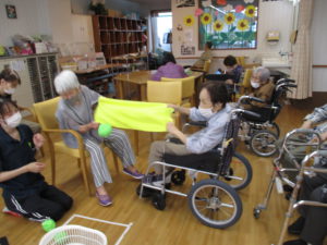 2024.08.17 ケアセンター土岐、心音日記 【土岐】今週のレクは?【デイサービス】 タオルで玉飛ばしです 二人で息を合わせて掛け声と 同時に玉をかごめがけて飛ばします 「簡単そうでできないね」 と皆さん楽しそうでした。 今週もお疲れさまでした。