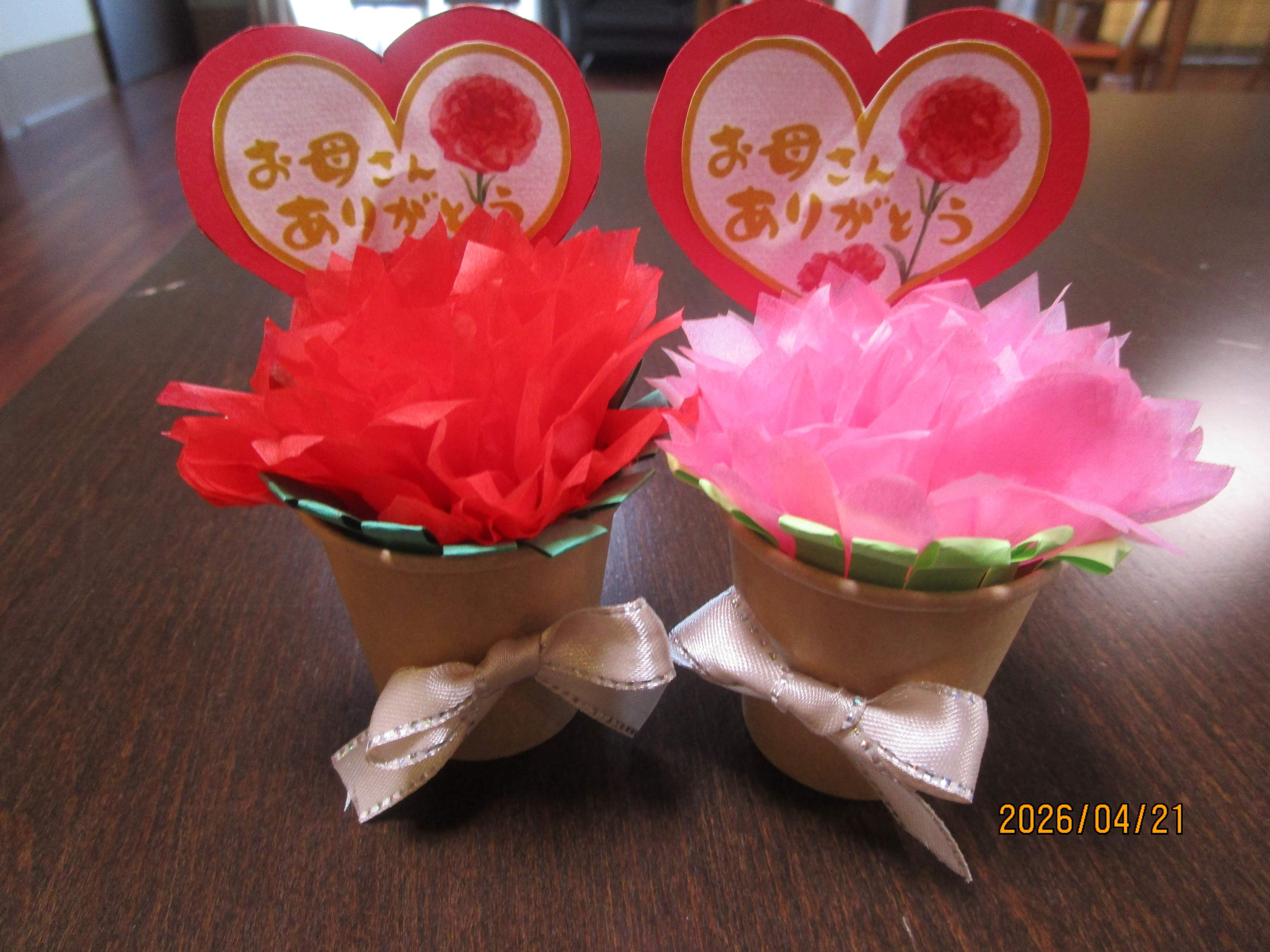 今回は、母の日に向けてお花紙と紙コップでカーネーションの置物を作りました!