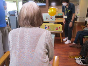 2021.09.14 ケアセンター笠松 【笠松デイサービス】バウンド玉入れ 皆さんこんにちわ、バウンド玉入れでーす 箱の中に点数が椅子に座ってボールを投げてますがうまく入るといいのですが 大きなボール それ入ったか そーれどうでしょう